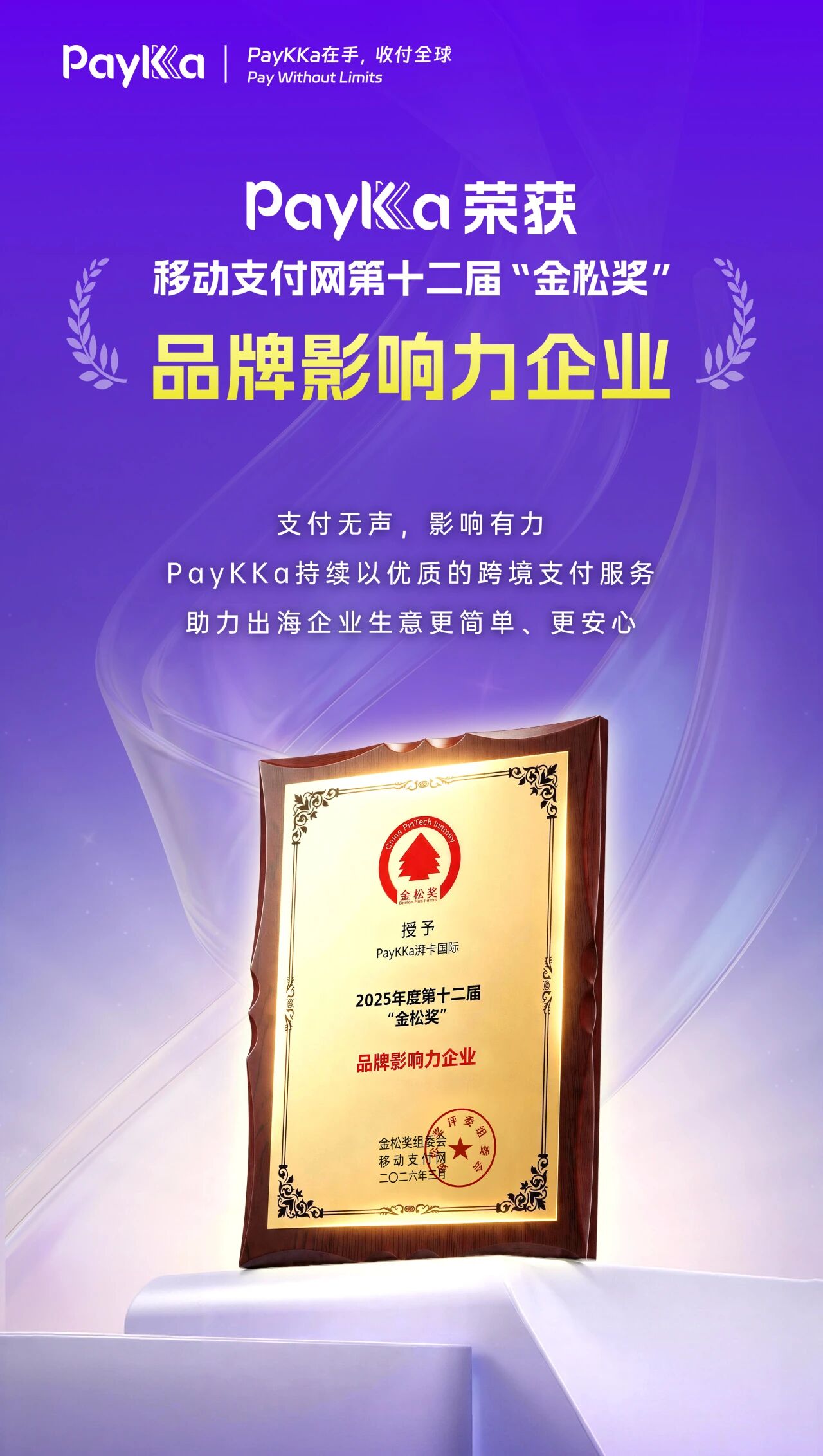 近日,由移动支付网主办的第十二届“金松奖”金融科技行业评选结果正式揭晓。在这场汇聚了近120个顶尖企业和方案/案例的角逐中,PayKKa凭借在跨境支付领域的深度服务和卓越品牌影响力,成功斩获“品牌影响力企业”奖项。